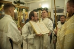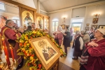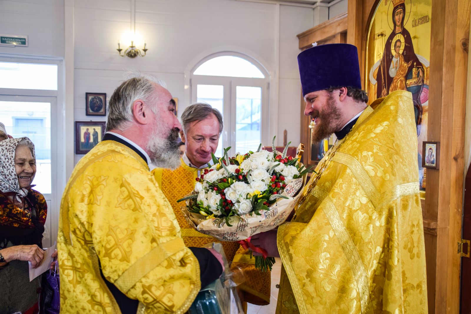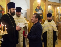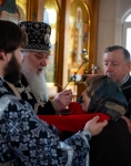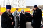 В ответном слове настоятель храма иерей Тимофей выразил глубокую благодарность Святейшему Патриарху и митрополиту Арсению за подаренную радость архиерейского служения в этот праздничный день, и от всего прихода Владыке была преподнесена икона святого страстотерпца царя Николая, которая является точной копией храмовой иконы. Как отметил отец настоятель, удивительная мудрость проявилась в выборе участка под строительство храма в честь святого царя. Если посмотреть на карту, то южнее находится Бутовский полигон, место упокоения огромного количества новомучеников. Восточнее находится спецобъект Сухановка, а на Западе Коммунарка, места пыток и расстрелов многих тысяч людей. И храм царя страстотерпца Николая севернее, таким образом, мы видим символический новомученический крест на юге Москвы.